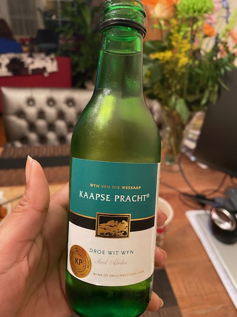 De eerste wijn is de Kaapse Pracht Droe Rooi Wyn. Ik ben heel benieuwd. Hoe kan een wijn vriendelijk zijn? Frisrood doet me ook vooral denken aan de rode dubbelfris. Mijn zus en ik deden vroeger ook alsof dat rode wijn was. Bijzonder, als je erover nadenkt. Maar goed, dat was ook in de tijd dat er nog chocoladesigaretten bestonden, dus ja. Terug naar de wijn. Hij ruikt erg fruitig. Daar komt het rode fruit naar boven. Een klein slokje en opnieuw heel fruitig. Meteen daarna vind ik hem vlak en wat flauw worden. Nu snap ik het vriendelijke. Ik denk dat dit een goede instap rode wijn is. Het vleugje kruiden komt terug in de afdronk. Niet echt mijn wijn dit.