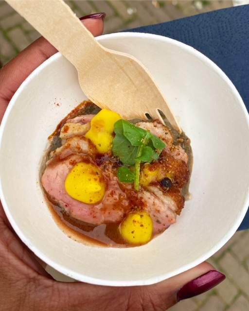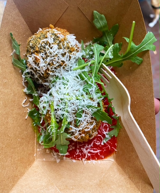 Onze volgende en laatste stop is op vijf minuten lopen. Nu hoop ik wel dat ik er goed aan heb gedaan om deze als laatste in de rij neer te zetten. We lopen naar Bar Pif en mogen naar binnen om onze bestelling door te geven en op te halen. Fijn, want dan kunnen we ook weer even opwarmen. De man vraagt expliciet naar mijn naam om op de bon neer te zetten. Ik kijk hem even aan, twijfel en zeg het dan. Dit gaat zo ongeveer vier keer fout, letters overslaan, van achter naar voren uitspreken, er zelf iets van maken maar uiteindelijk heeft ie ‘m. Geen oordeel hoor, dit is gewoon altijd hoe het gaat. Zo heeft mijn huisarts mij vroeger altijd Anja genoemd, viel ook niets tegenin te brengen. Ada is nu ook een veelgebruikt grapje onder mijn collega’s. Hoe dan ook, hij gebruikt mijn naam niet alleen voor de bon. Maar vraagt zijn collega ook om mij verder te helpen en later om het gerechtje naar mij toe te brengen. Ik moet zeggen, het is leuk. Het wordt wat persoonlijker zo alsof we elkaar al even kennen. Hoewel, hij mij dan. Ik heb geen idee wat zijn naam is. We krijgen onze wijn in een koffie to go-cup want alcohol op straat mag niet. Ik zie overigens ook wat mensen met een fles en een papieren zak. Dat is dan weer net te erg hobo-life voor mij. We krijgen een bakje met Arancini. Dat zijn gefrituurde risottoballetjes. Zo fijn dat we eindigen met iets warms. De risotto is klaargemaakt met cavolo nero, ook wel palmkool, een soort boerenkool waardoor het een groene kleur heeft gekregen. Deze bite heeft alles, de cliché crunchy van buiten, zacht en romig van binnen. De kaas die eroverheen geraspt is, geeft samen met de rucola pit aan het gerechtje. Dit smaakt naar meer. Als alles weer kan, kom ik hier graag nog eens eten.